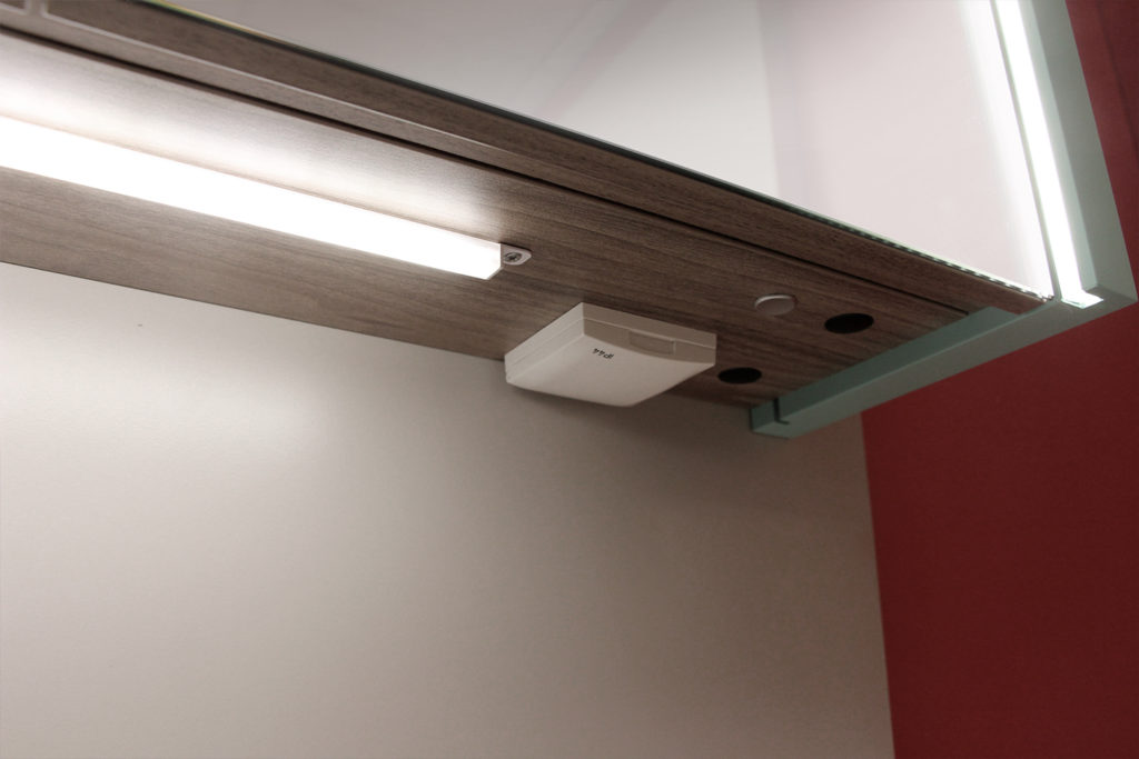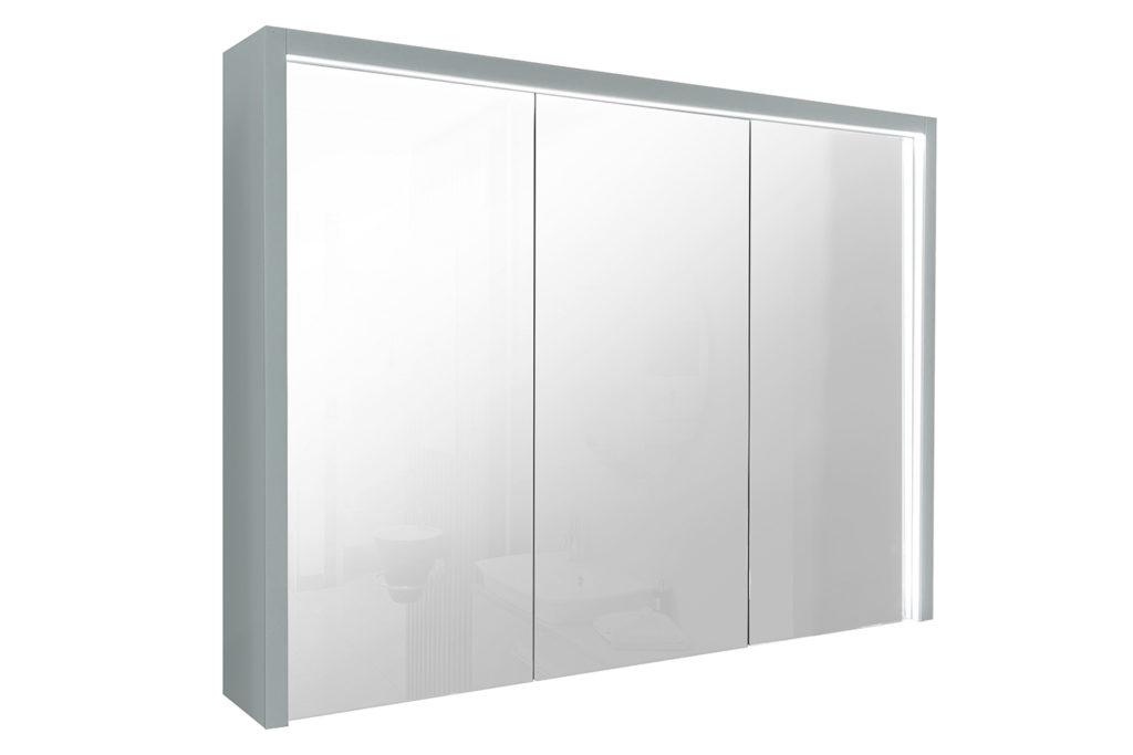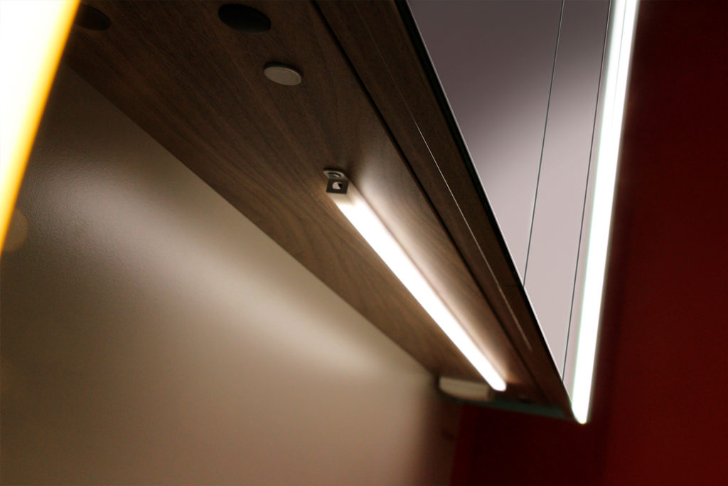 Interior finish in bleached walnut I Handle in varnished polished stainless steel I 6 adjustable glass shelves I All-round LED strip recessed in front I LED with on-off button and sensitive-touch dimmer underneath the cabinet I Electrical socket
