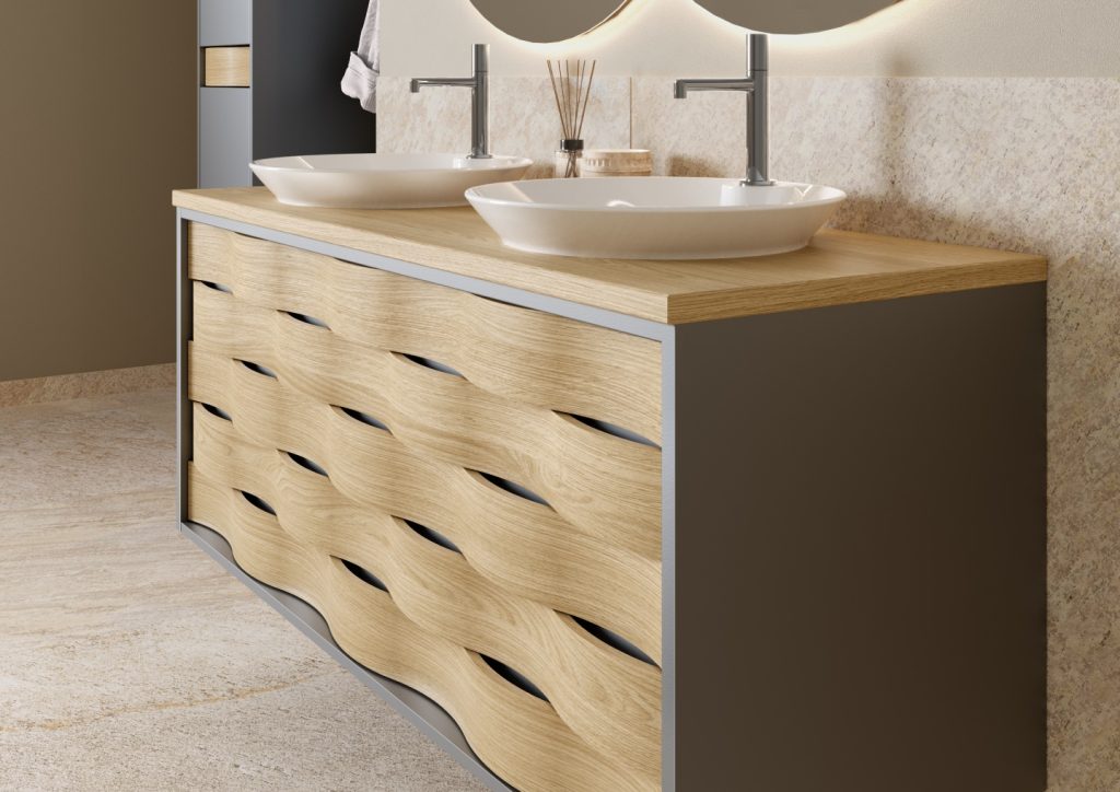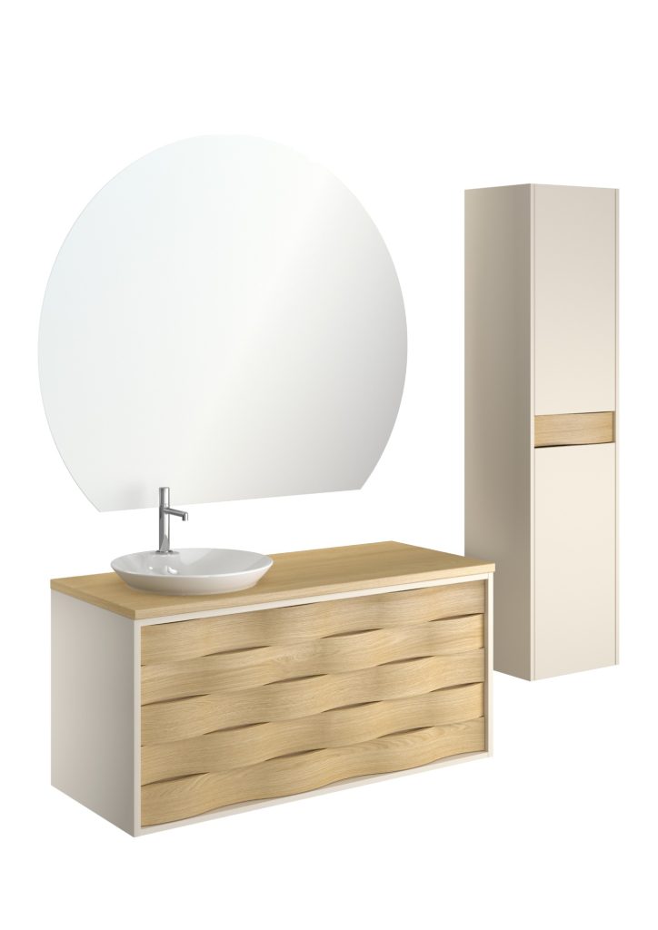 – Natural oak vanity top matching the fronts + semi-recessed sink