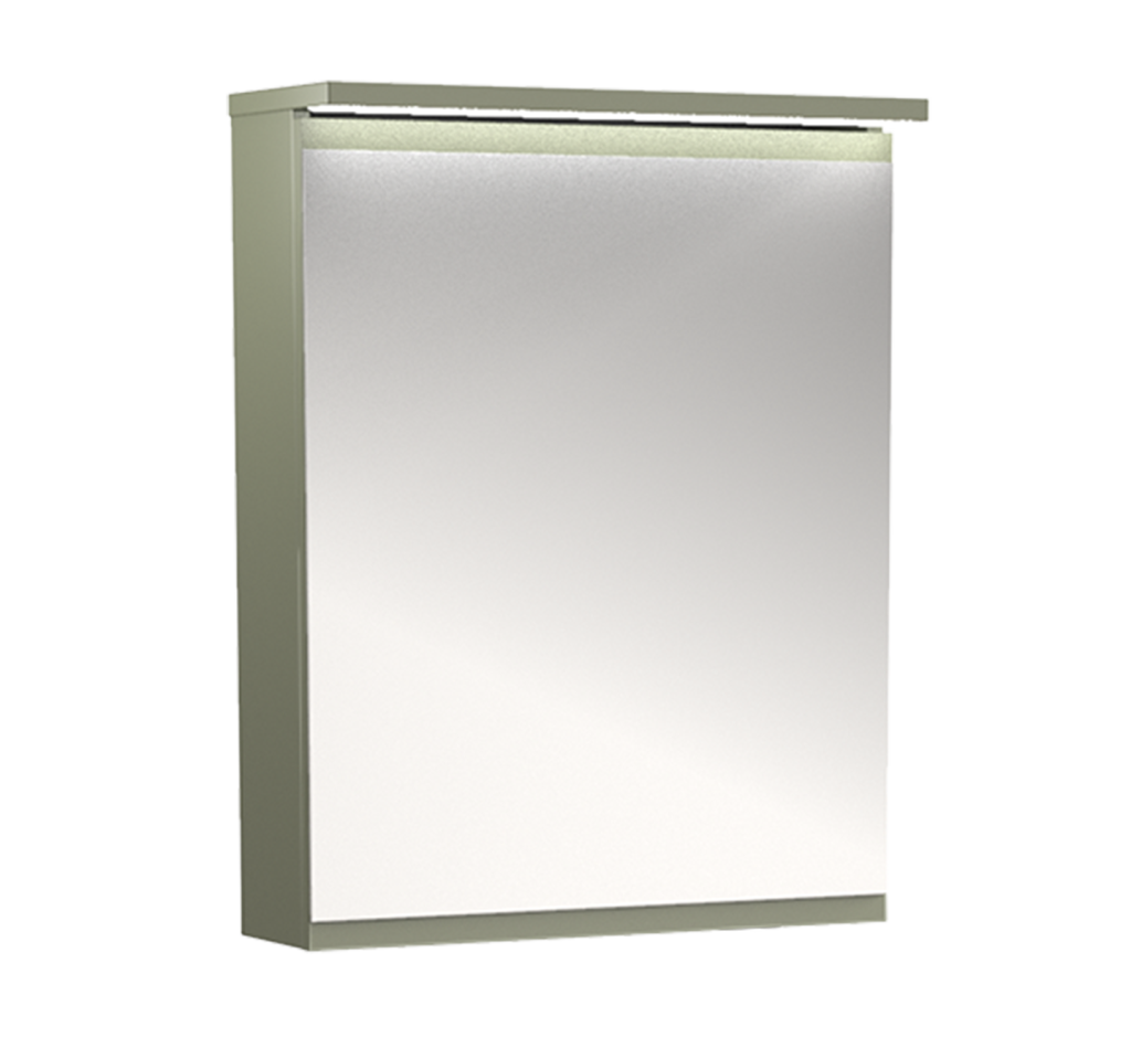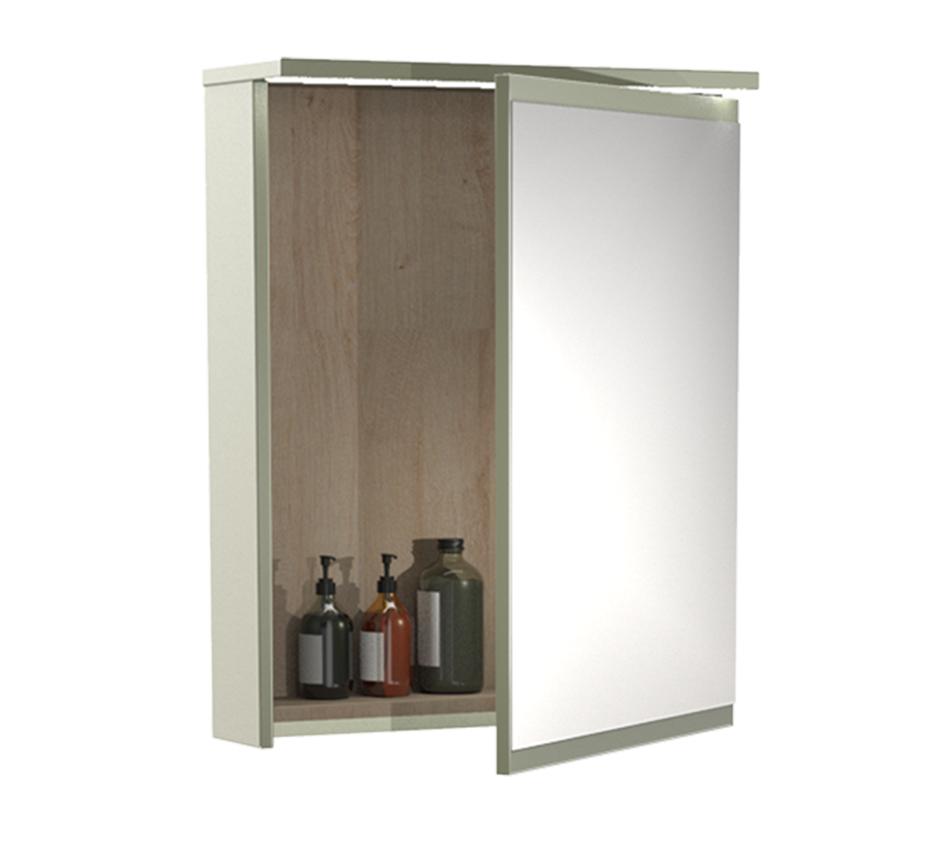 Cabinet L55 cm- 1 reversible mirrored door (right / left) I delivered with hinges on the left I 2 glass shelves I Equipment: LED lighting at the top I 230 V external power socket underneath the cabinet I Class II- IP44- CE- 4500°K I Available in 30 shades of glossy, extra-matte and metallic lacquers + 2 wood decors.