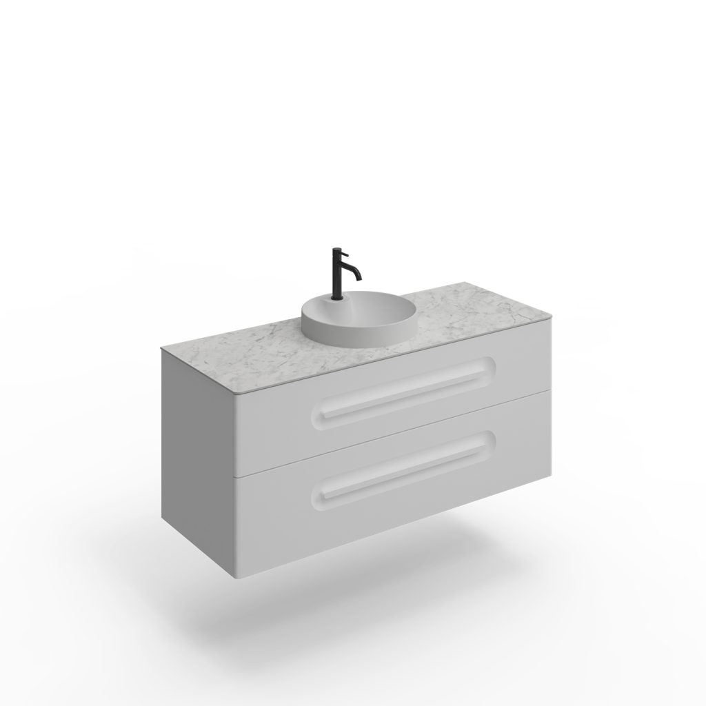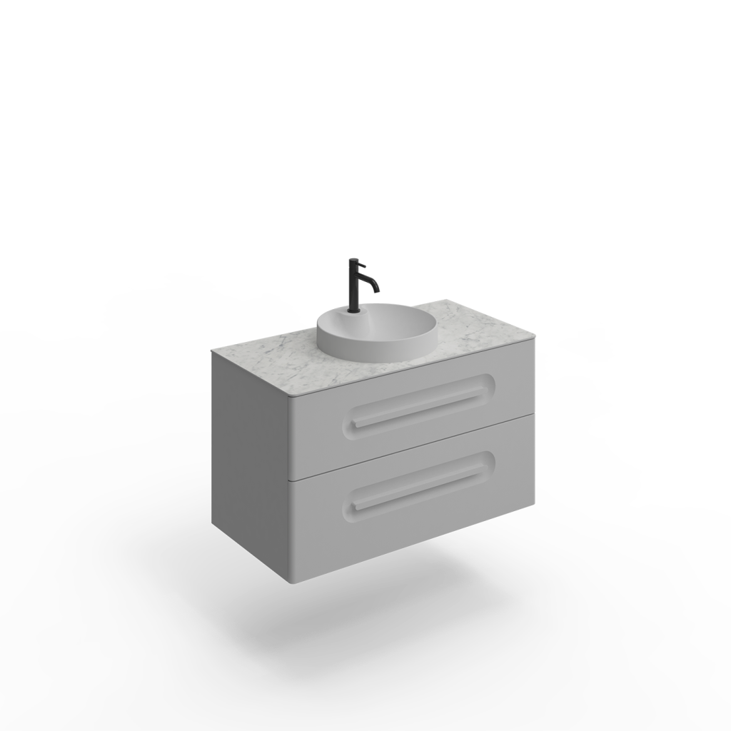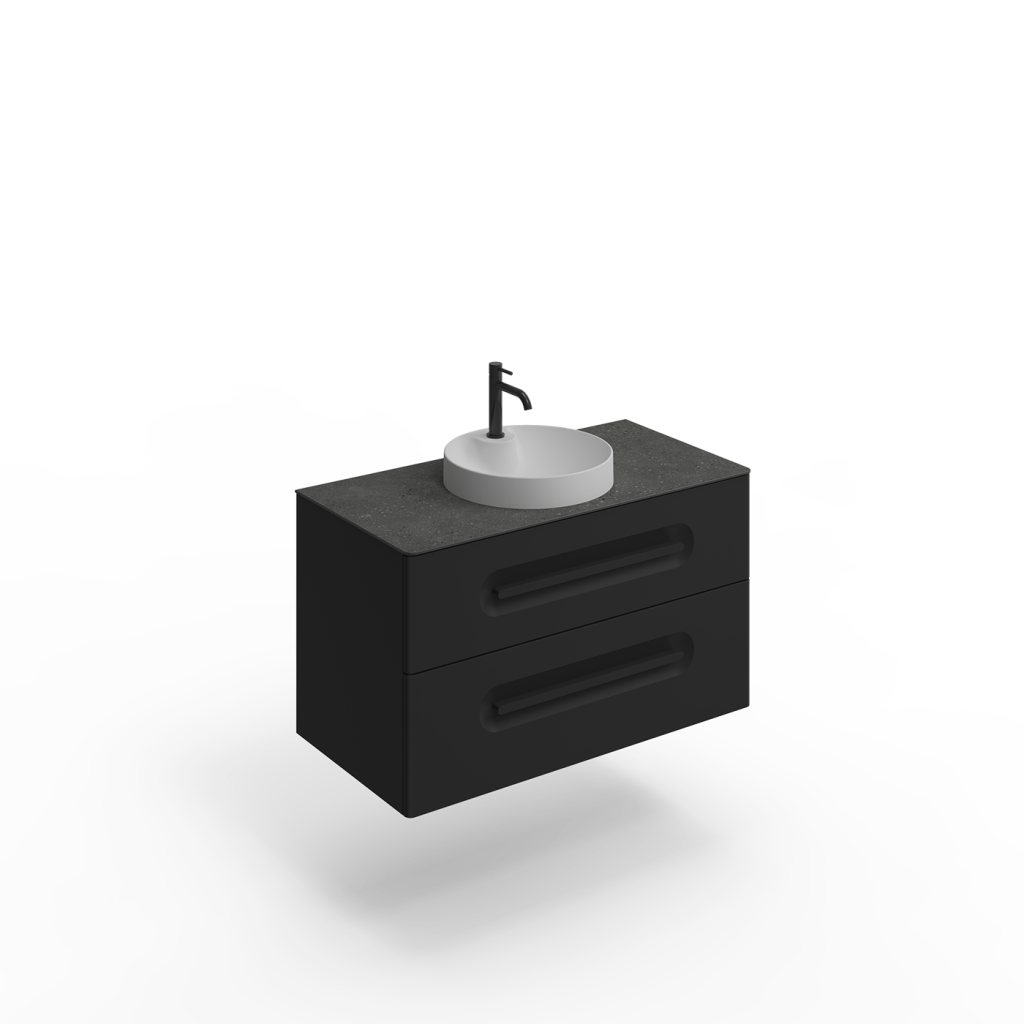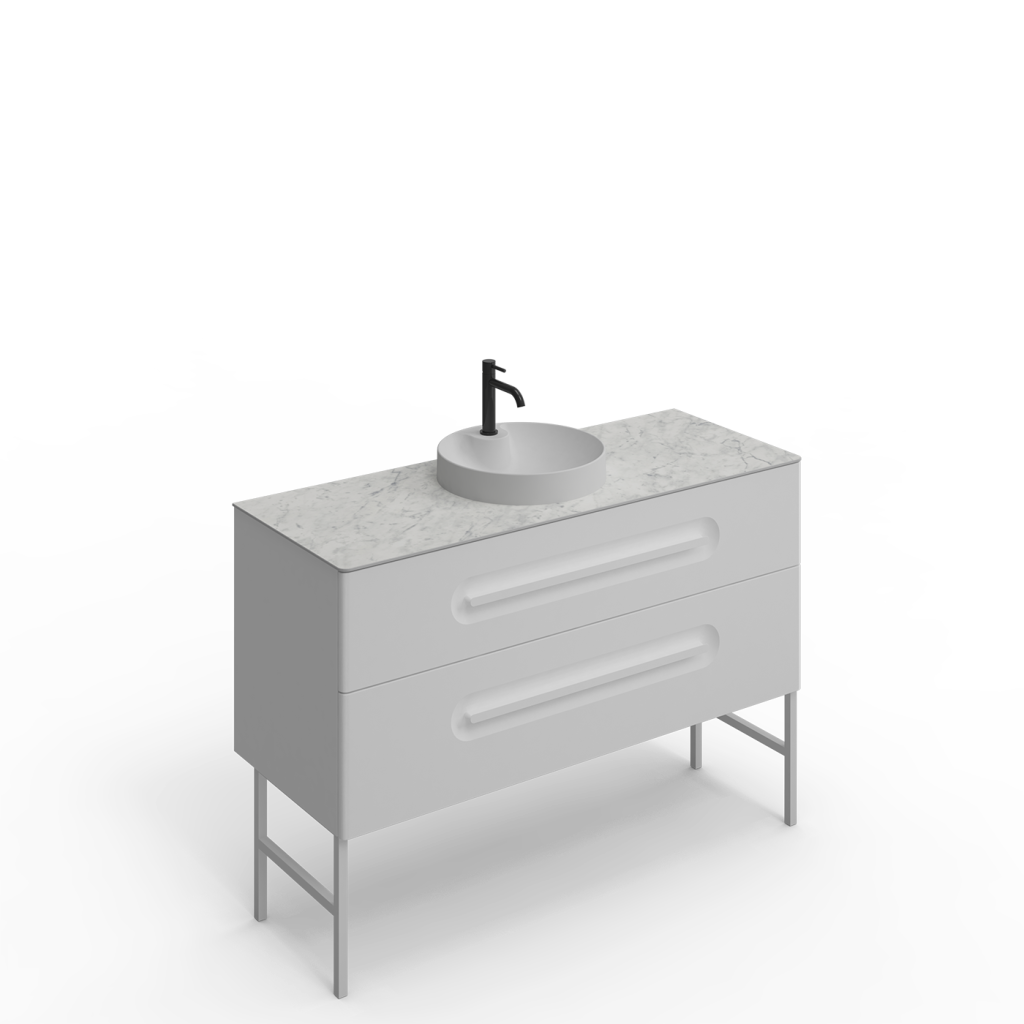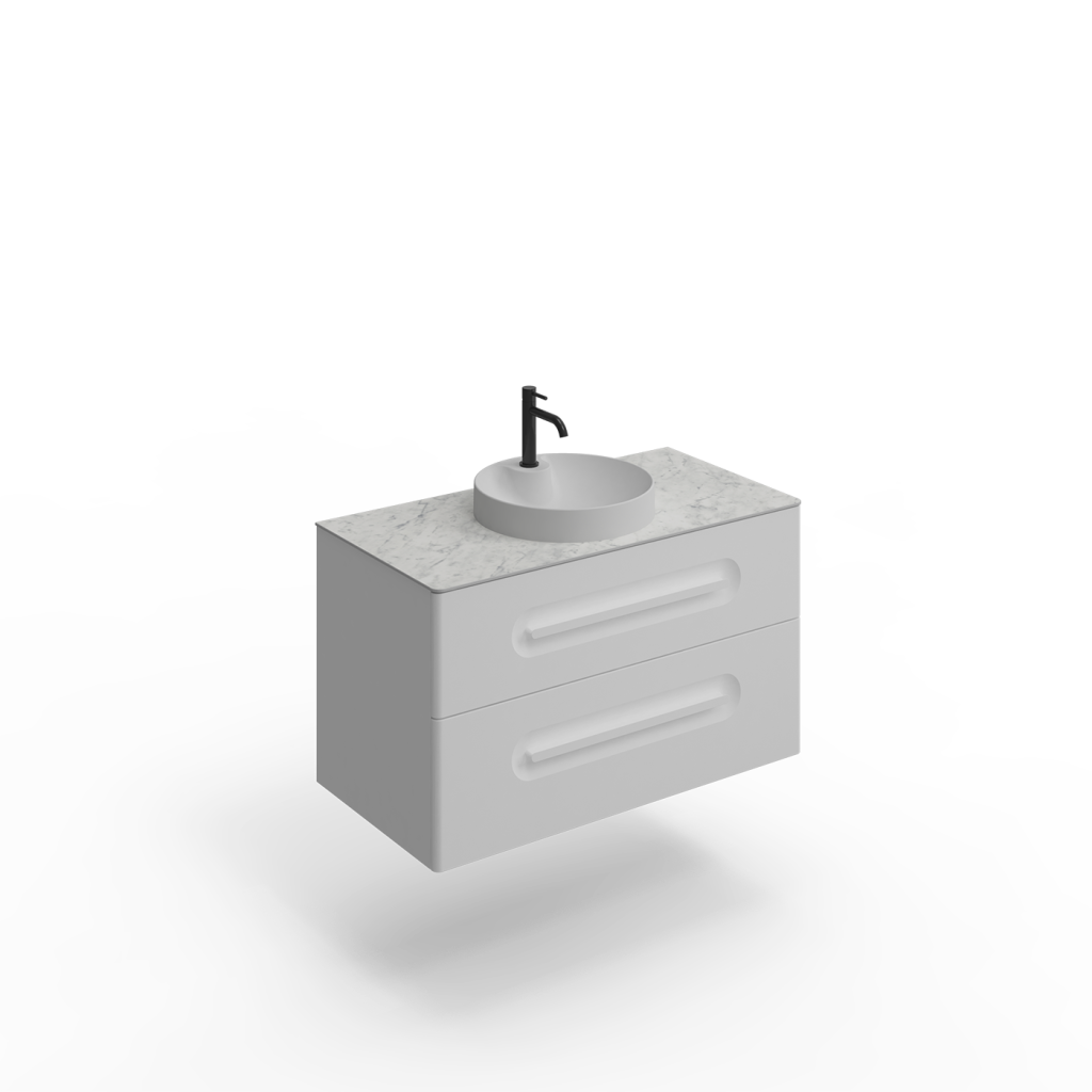 Decorative ceramic top, thickness 6 mm. Round semi-recessed washbasin in solid surface matt polar white, without overflow, height 6 cm.