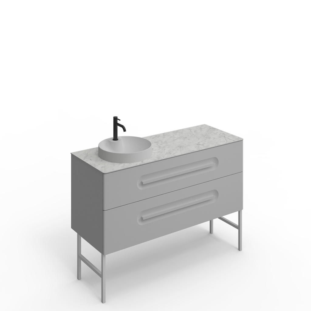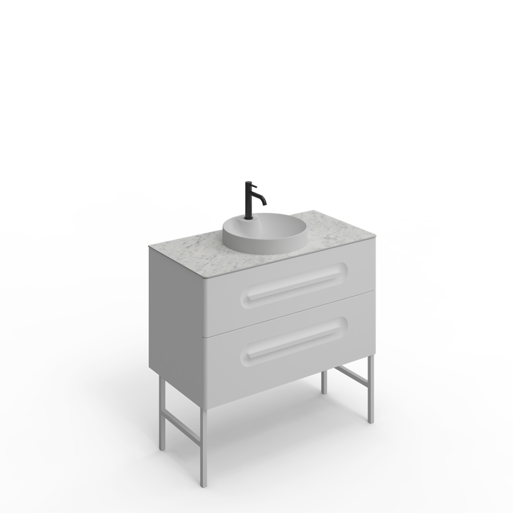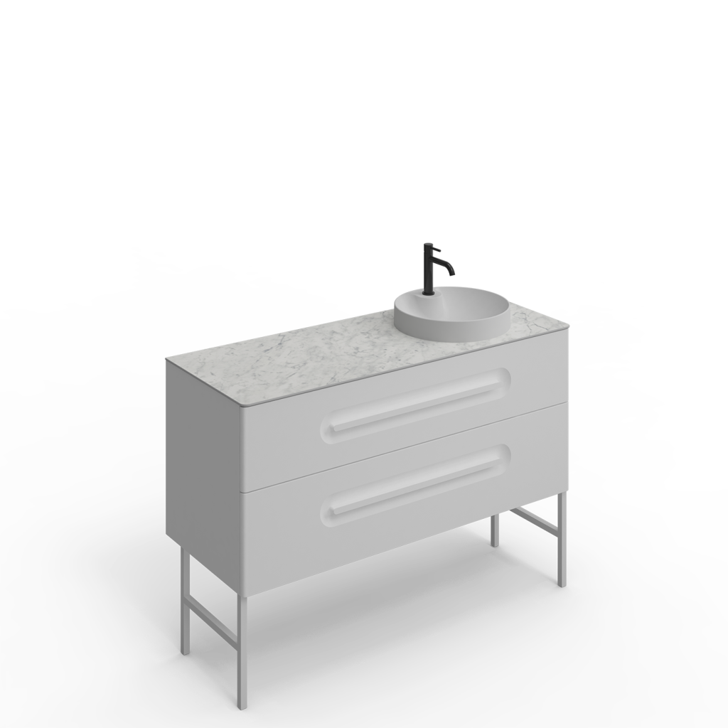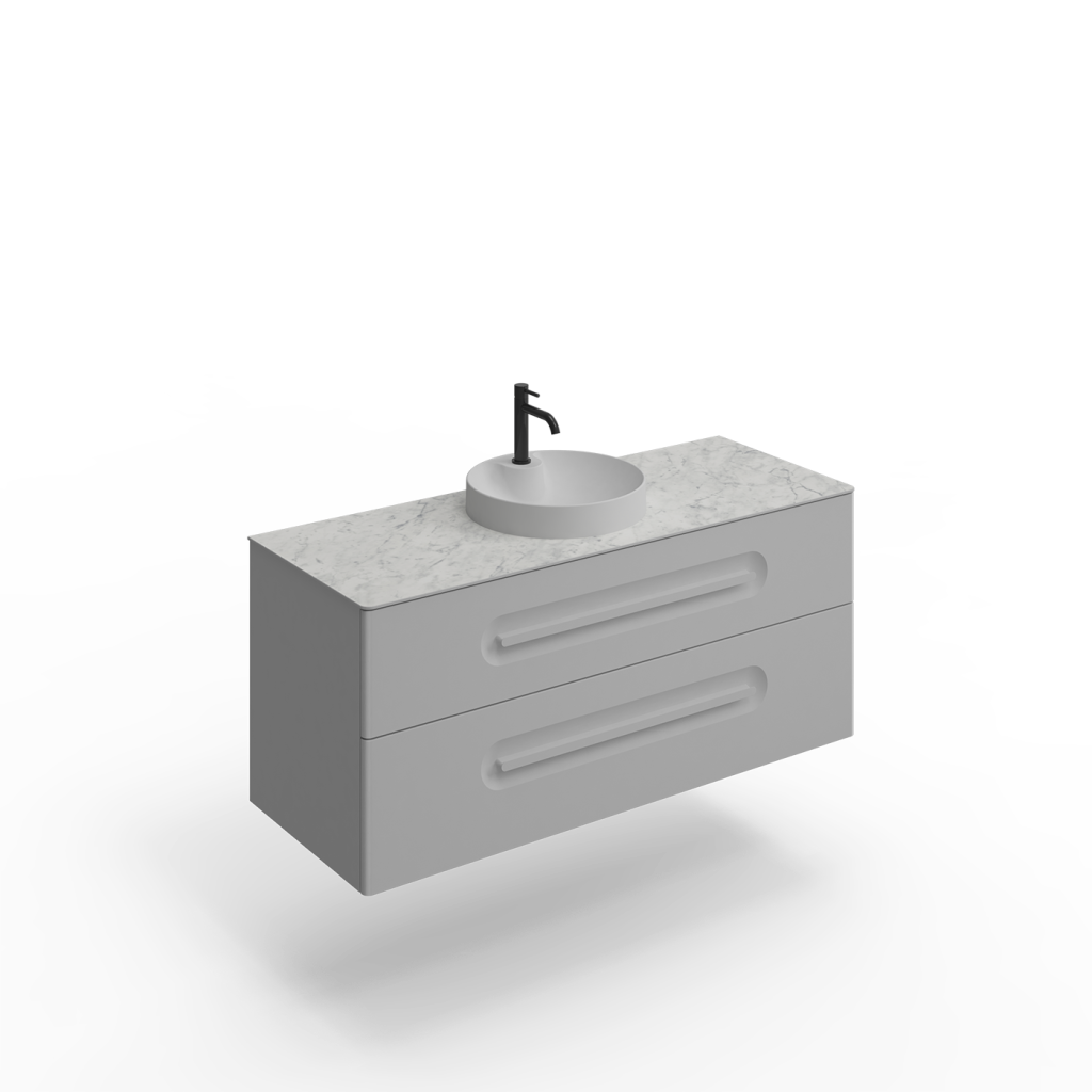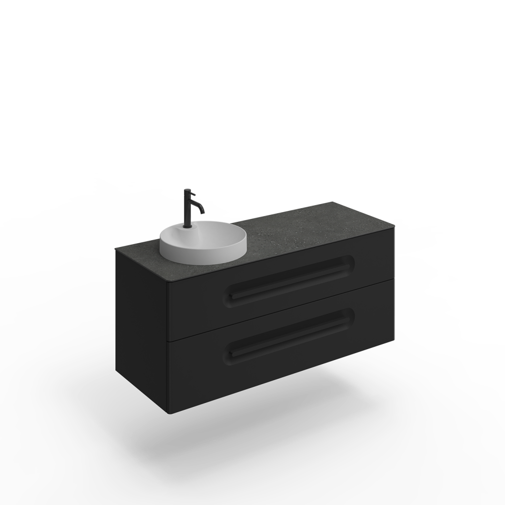 Decorative ceramic top, thickness 6 mm. Round semi-recessed washbasin in solid surface matt polar white, without overflow, height 6 cm.