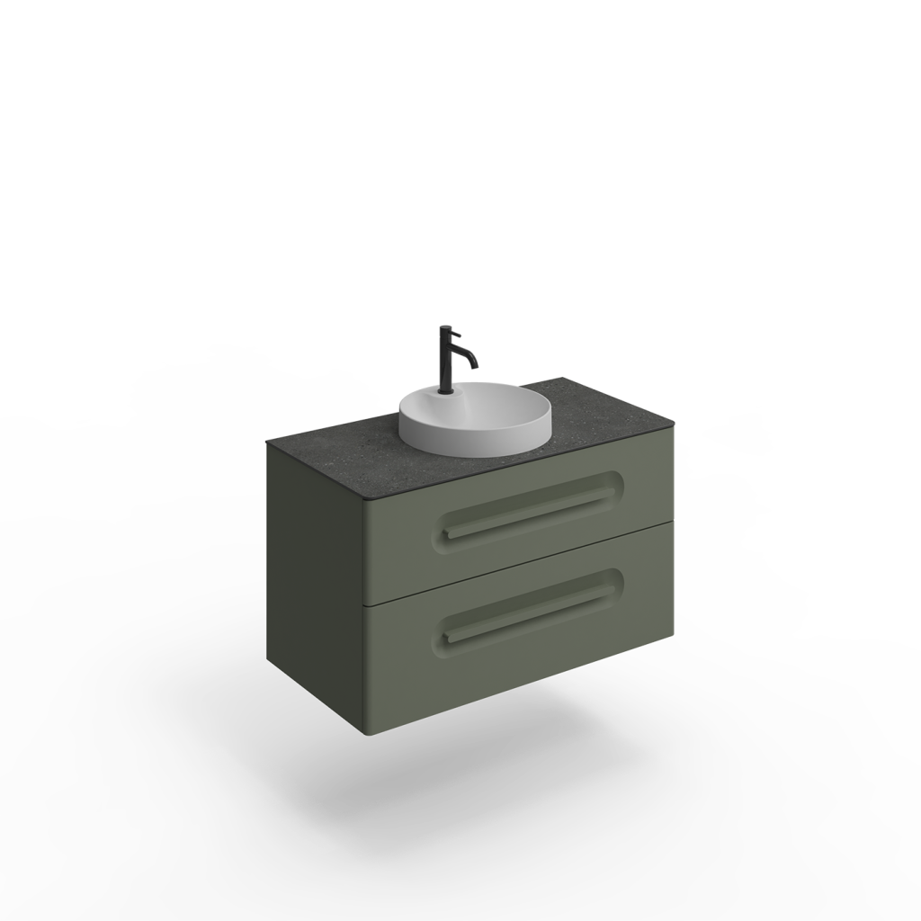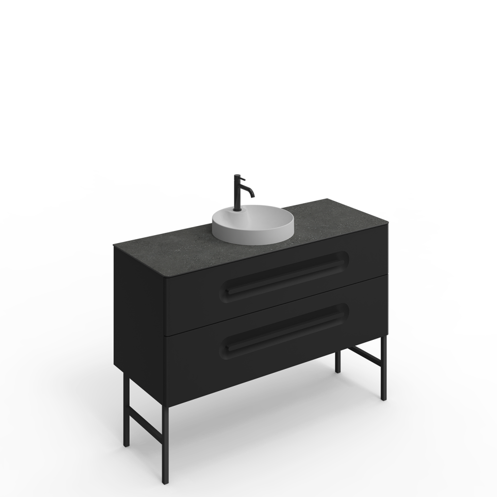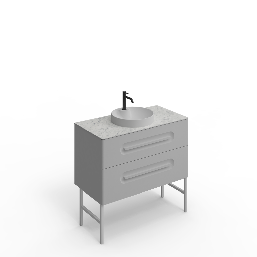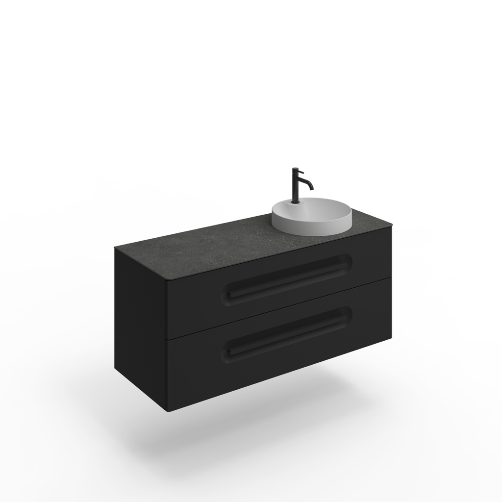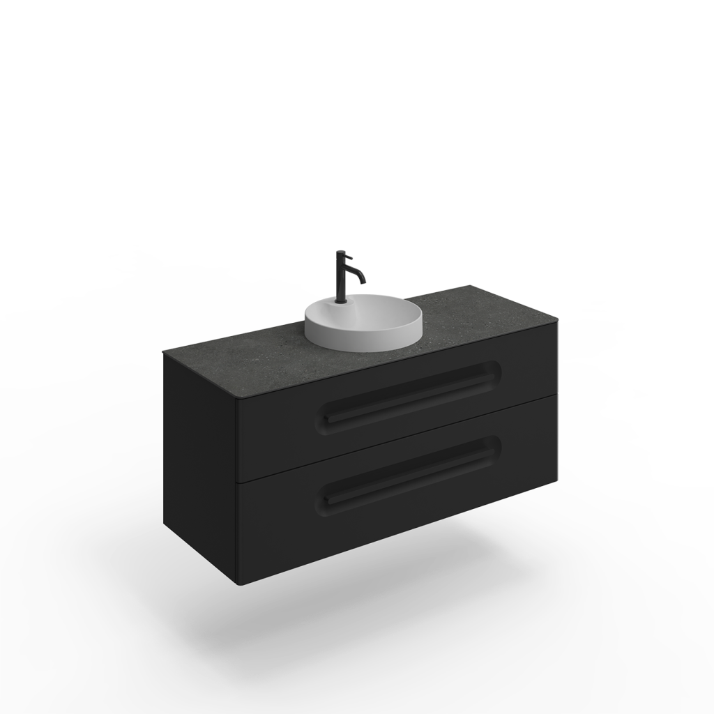 Decorative ceramic top, thickness 6 mm. Round semi-recessed washbasin in solid surface matt polar white, without overflow, height 6 cm.
