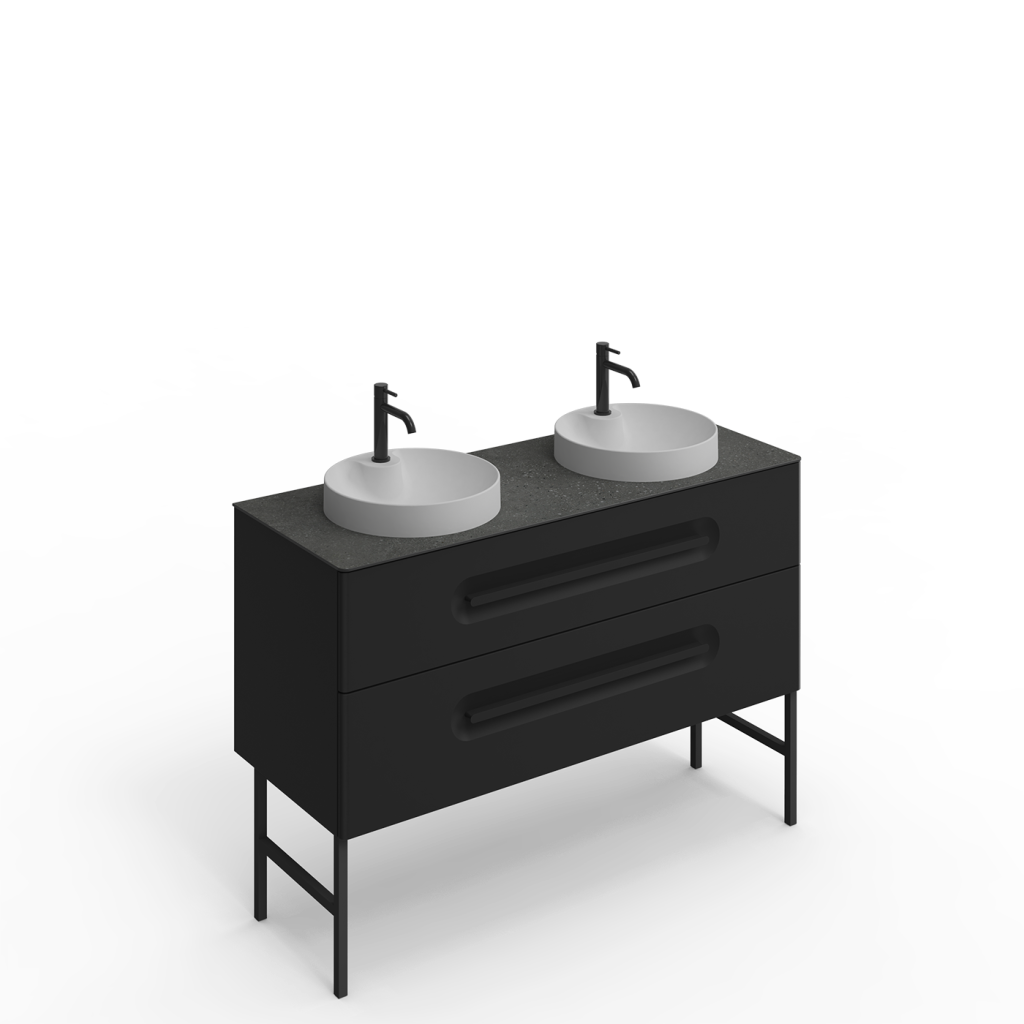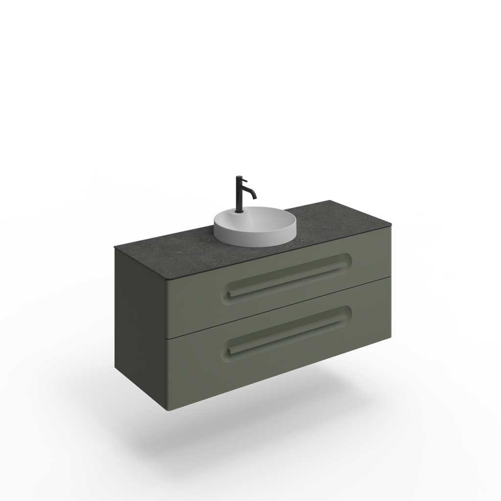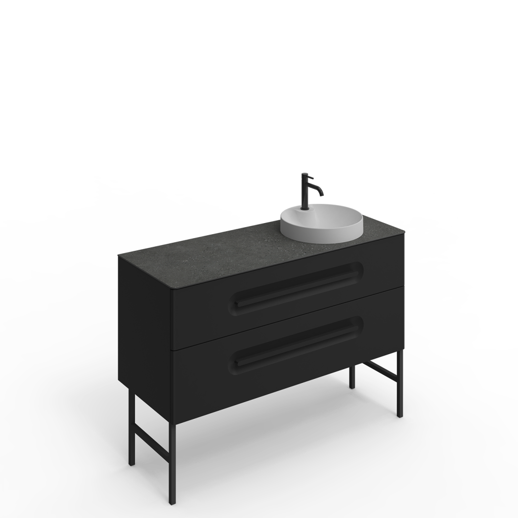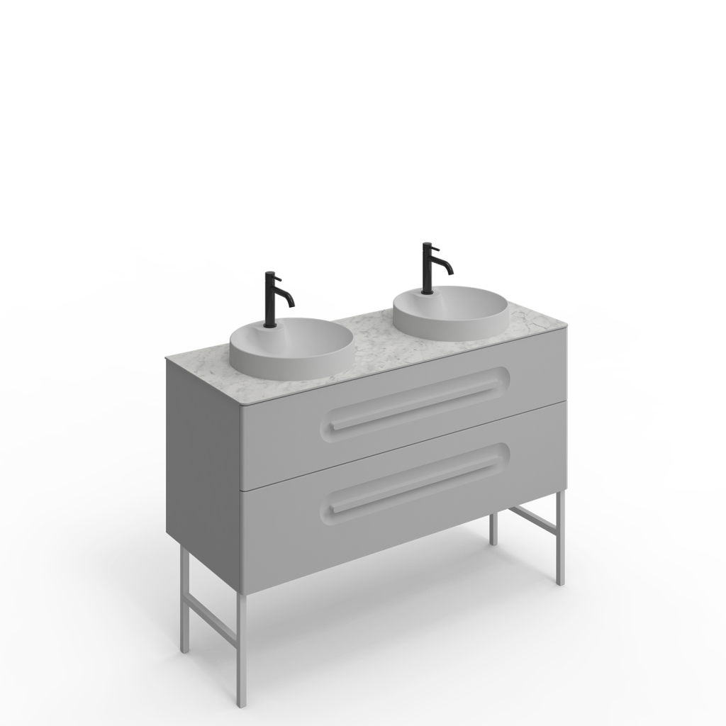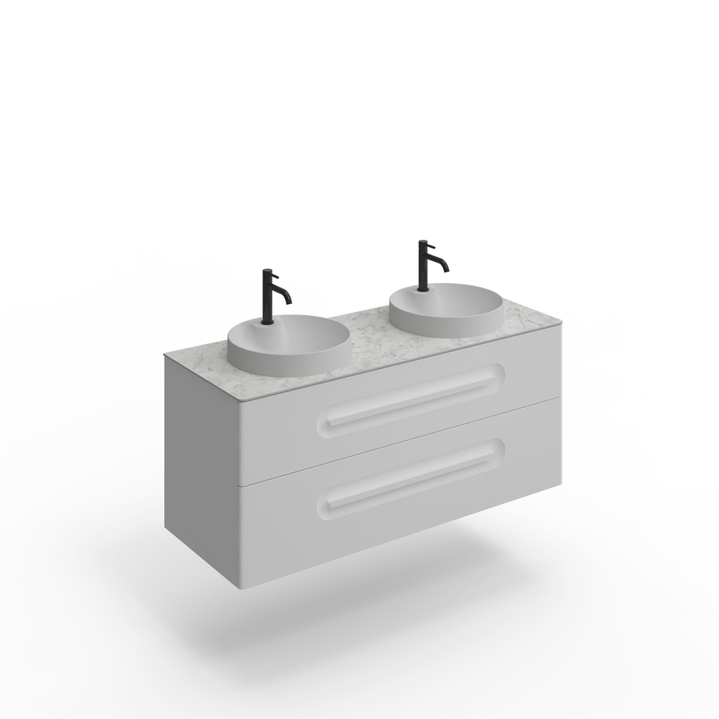 Decorative ceramic top, thickness 6 mm. Round semi-recessed washbasin in solid surface matt polar white, without overflow, height 6 cm.