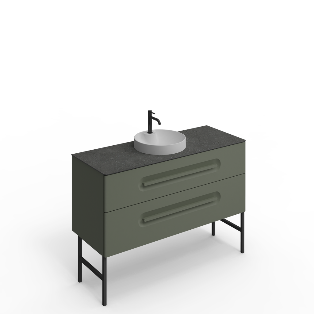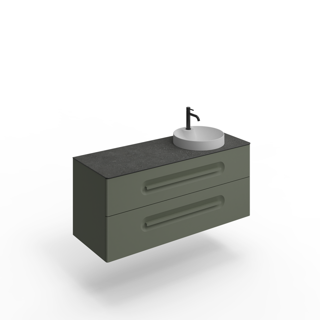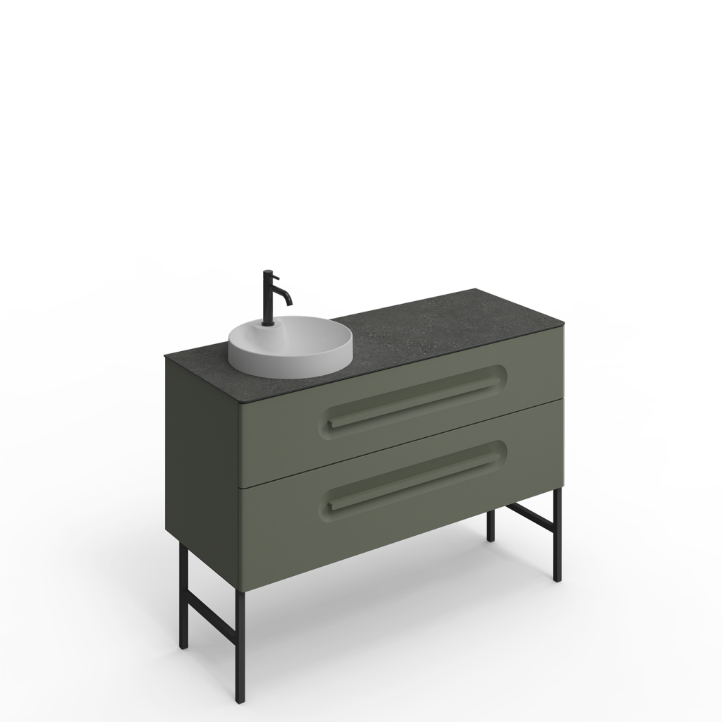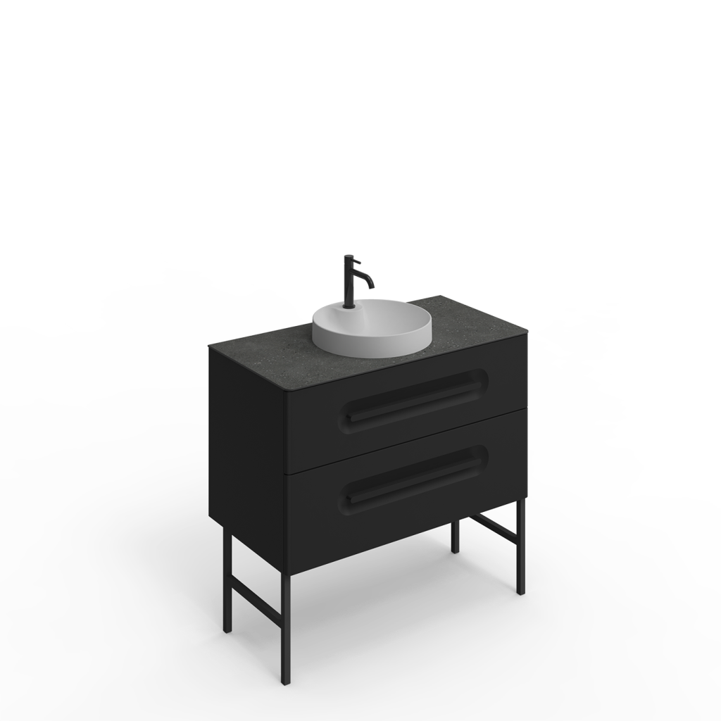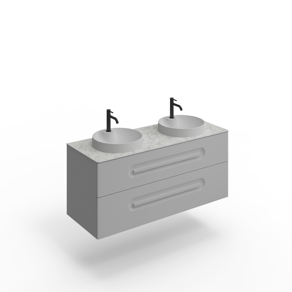 Decorative ceramic top, thickness 6 mm. Round semi-recessed washbasin in solid surface matt polar white, without overflow, height 6 cm.