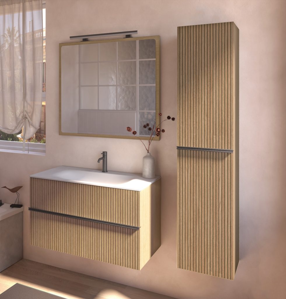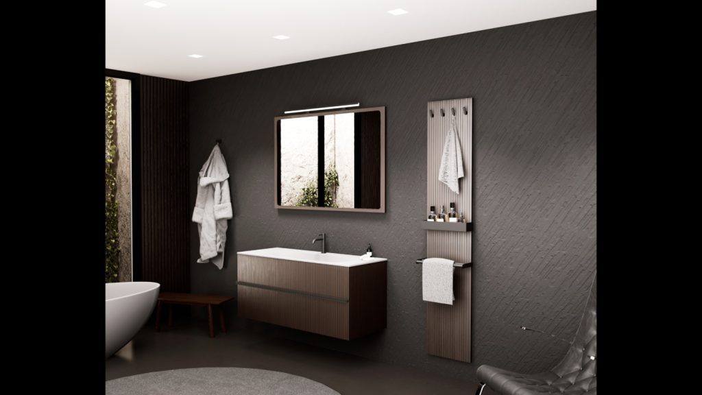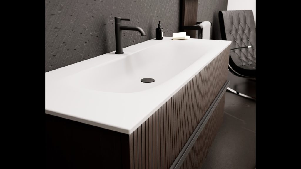 The WOODY washbasin cabinet is characterized by its modern interpretation of woodwork punctuated with matte black. Rhythm and texture are in warm and unique harmony. Trendy single and double sinks.