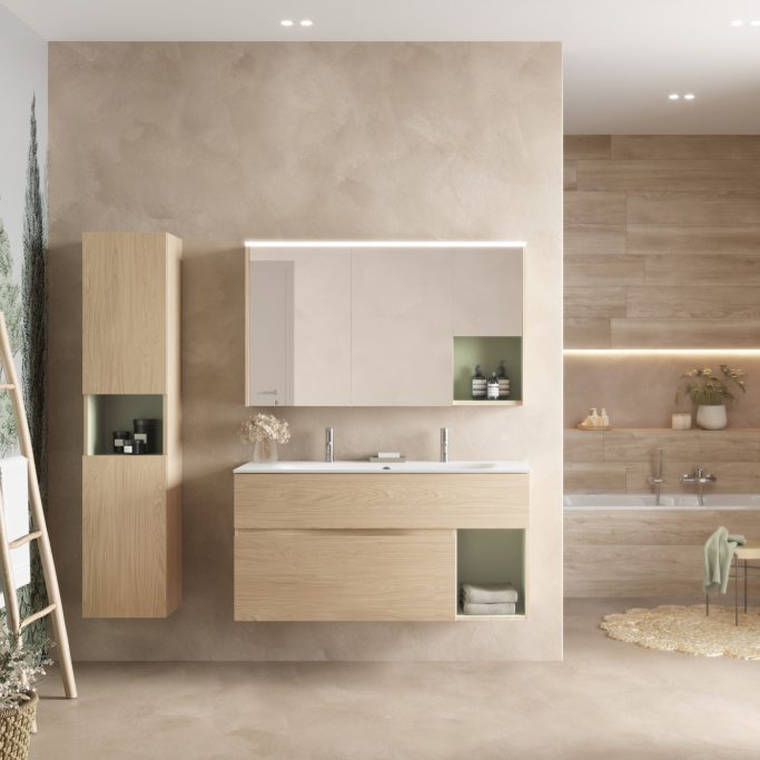 BELLA VISTA Vendu exclusivement chez Aubade Le BELLA VISTA, entre bois et laques, présente un élégant mix-matière très tendance. Sa modularité permet de répondre à vos envies. Meuble vasque pour plan monobloc simple ou double, ou plan + vasque à poser en Céramique ou Solid Surface. Niche ouverte, module à tiroirs ou 1 porte, miroir…